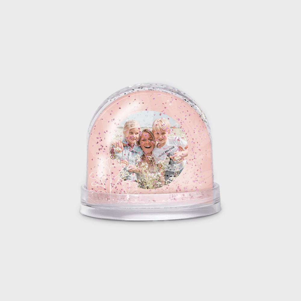 Fleur iemands dag op met een gepersonaliseerde sneeuwbol vol glitters! Deze Plexiglas wereldbol van hoge kwaliteit is aan beide zijden full colour bedrukt met je favoriete foto en tekst. Schud de wereldbol om de glitters vrolijk rond te zien dwarrelen, waardoor het een leuk en gedenkwaardig cadeau is voor verjaardagen, feesten of om een speciaal tintje aan je huis te geven. Pas je wereldbol eenvoudig aan met een foto en boodschap voor een echt uniek aandenken!